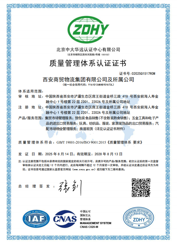 近日,西安商貿(mào)物流集團(tuán)及所屬公司獲得ISO9001質(zhì)量管理體系認(rèn)證證書。這是集團(tuán)組建成立后在推進(jìn)戰(zhàn)略規(guī)劃、塑造品牌形象、提升國內(nèi)外綜合實(shí)力進(jìn)程中的又一重要成果,標(biāo)志著集團(tuán)在國際化、制度化、規(guī)范化管理方面邁上新臺階。