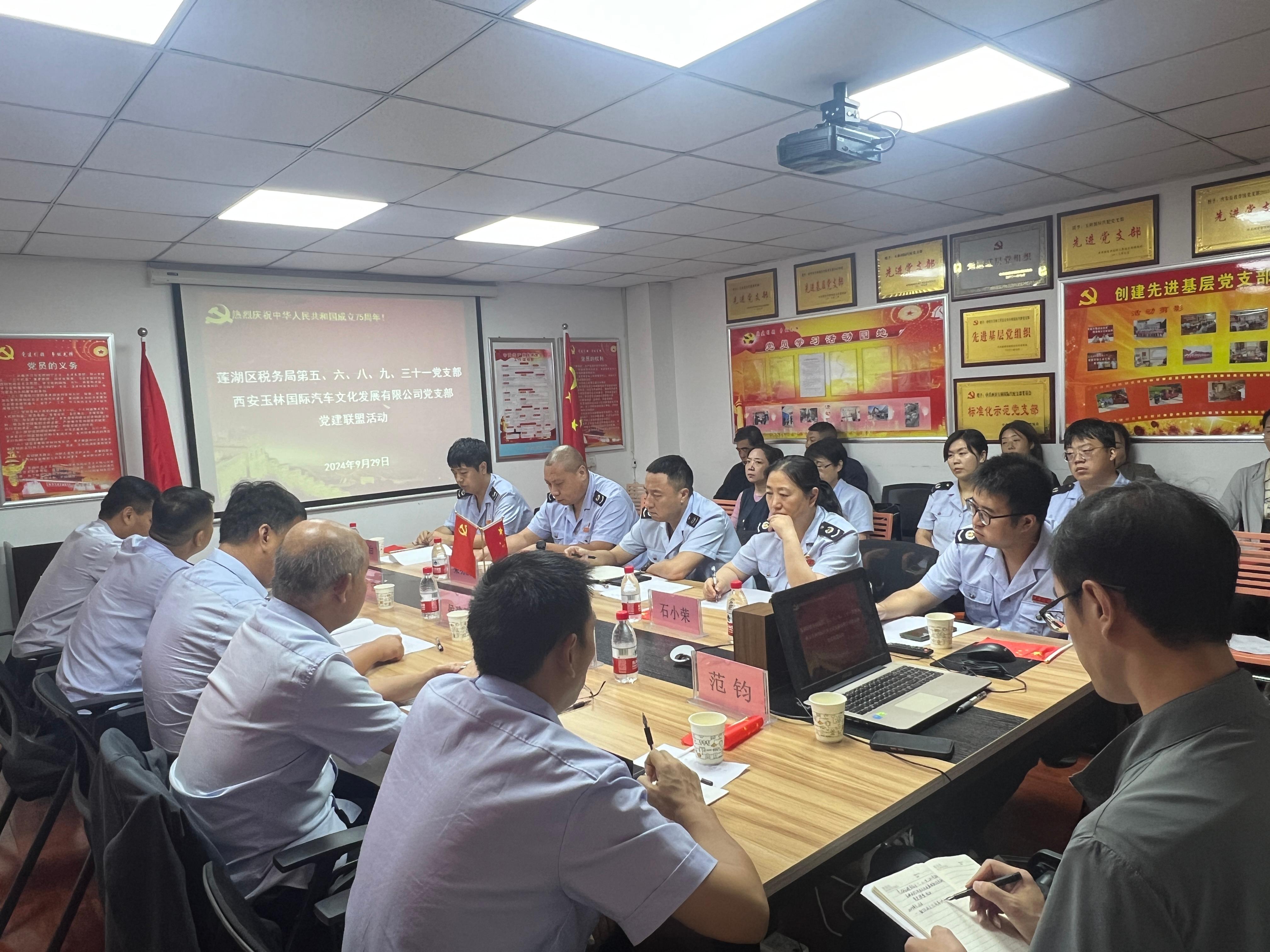 為全面貫徹落實(shí)習(xí)近平新時(shí)代中國(guó)特色社會(huì)主義思想和黨的二十屆三中全會(huì)精神,推動(dòng)黨紀(jì)學(xué)習(xí)教育常態(tài)化長(zhǎng)效化,以新作風(fēng)、新作為、新成績(jī)慶祝中華人民共和國(guó)成立75周年。9月29日,西安玉林國(guó)際汽配黨支部聯(lián)合西安市蓮湖區(qū)稅務(wù)局下屬第五、六、八、九、三十一黨支部圍繞政治建設(shè)、紀(jì)律建設(shè)、業(yè)務(wù)交流、營(yíng)商環(huán)境提升等內(nèi)容開(kāi)展稅企黨建聯(lián)盟活動(dòng)。公司黨員代表、環(huán)西稅務(wù)所各支部黨員代表、市場(chǎng)商戶(hù)代表共計(jì)20余人參加了此次活動(dòng)。