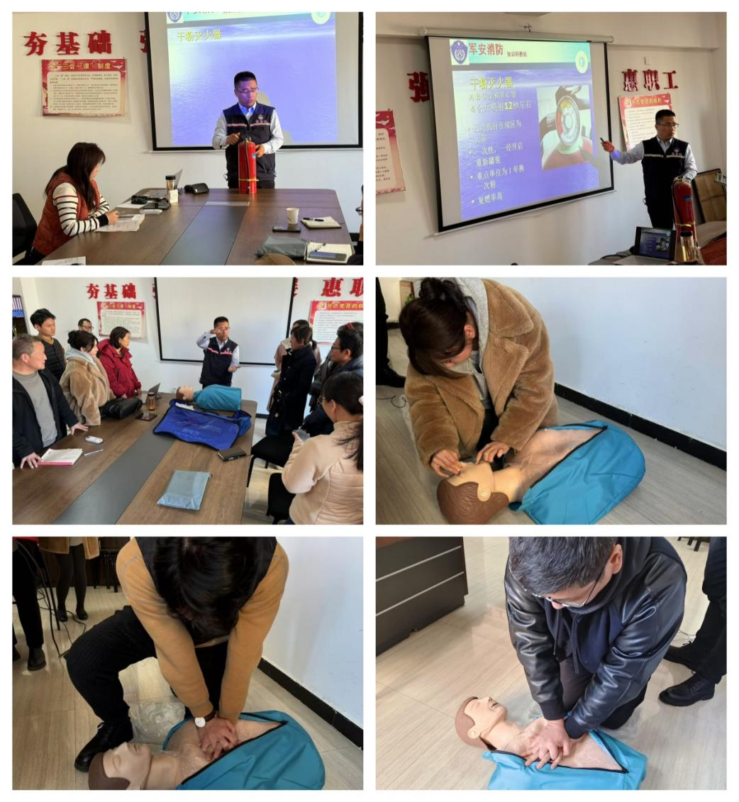 培訓(xùn)會(huì)上,教官通過“小火亡人”典型事故案例剖析與實(shí)際操作相結(jié)合的方式,全面細(xì)致講解火災(zāi)預(yù)防(如辦公及租賃場(chǎng)所電氣設(shè)備規(guī)范使用、電動(dòng)車電池等易燃物存放要點(diǎn))、火災(zāi)報(bào)警流程及注意事項(xiàng)、各類滅火器材(干粉、水基、氣溶膠滅火器)使用方法演示及實(shí)操練習(xí),以及逃生自救技巧(濕毛巾捂住口鼻或佩戴防煙面具彎腰低姿前行、正確選擇疏散通道)、急救演練等方面內(nèi)容,確保員工在實(shí)操中加深對(duì)消防安全知識(shí)的理解。